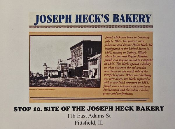 Site of the first Pike County courthouse in Pittsfield. The building was sold to Joseph Heck, a native of Durmersheim, Germany, born there in 1822. Heck emigrated to America in 1846, moving first to Philadelphia, Pennsylvania, and then here to Pittsfield in 1855. He was a grocer, baker and confectioner. John Nicolay took Lincoln to "Penny Hecks" for cider and gingerbread Oct 1, 1858, during his Senatorial campaign visit." The original courthouse building was demolished in 1880 and replaced with a two story brick building that also served as a bakery. It was demolished in 2018.