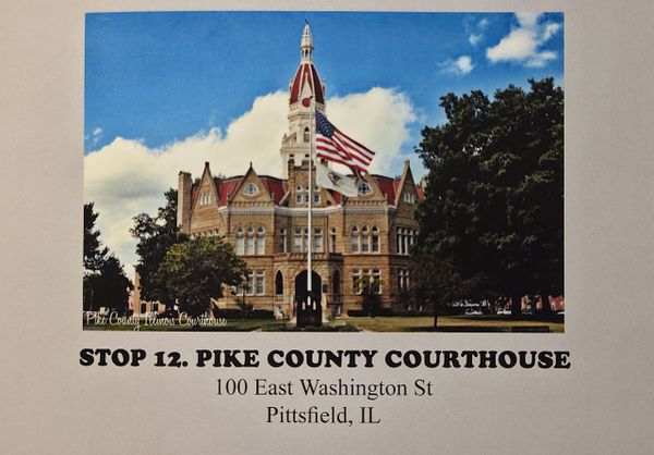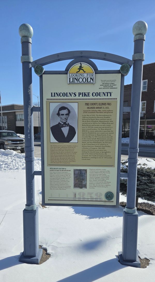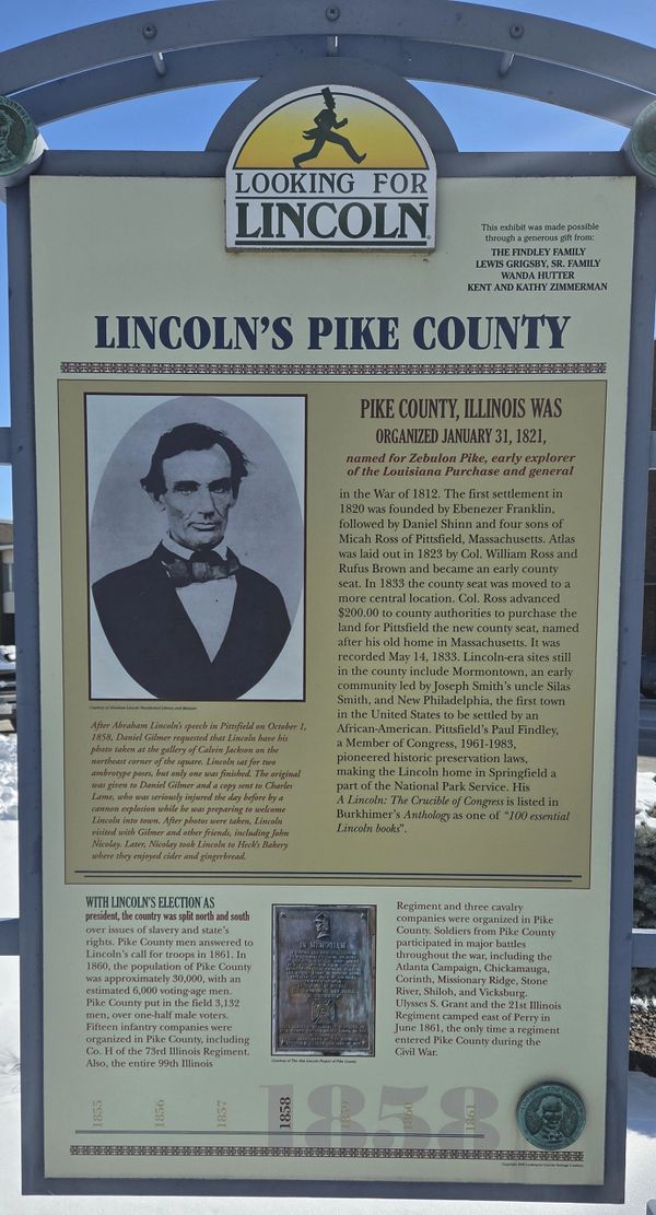 The text on the wayside exhibit reads, "Pike County, Illinois was organized January 31, 1821, named for Zebulon Pike, early explorer of the Louisiana Purchase and general in the War of 1812. The first settlement in 1820 was founded by Ebenezer Franklin, followed by Daniel Shinn and four sons of Micah Ross of Pittsfield, Massachusetts. Atlas was laid out in 1823 by Col. William Ross and Rufus Brown and became an early county seat. In 1833 the county seat was moved to a more central location. Col. Ross advanced $200.00 to county authorities to purchase land for Pittsfield the new county seat, named after his old home in Massachusetts. It was recorded May 14, 1833. Lincoln-era sites still in the county include Mormontown, an early community led by Joseph Smith's uncle Silas Smith, and New Philadelphia, the first town in the United States to be settled by an African-American. Pittsfield's Paul Findley, a Member of Congress, 1961-1983, pioneered historic preservation laws, making the Lincoln home in Springfield a part of the National Park Service. His A Lincoln: The Crucible of Congress is listed in Burkhimer's Anthology as one of "100 essential Lincoln books".