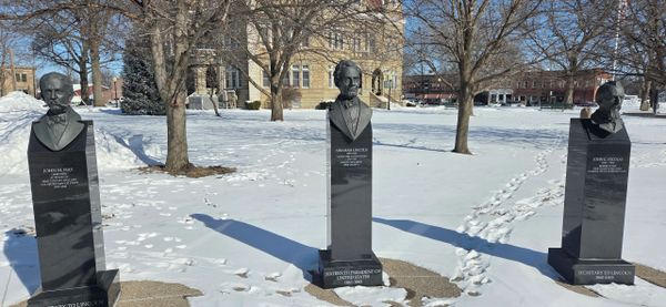 Statues of Abraham Lincoln and his assistants, John Hay and John Nicolay, now stand near the grounds on which the original courthouse was built.