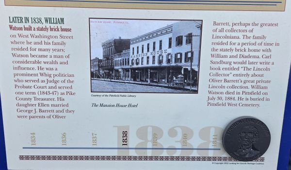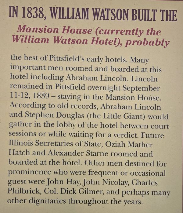 The hotel was built in 1838 by William Watson and called The Mansion House. Many important guests stayed at this hotel including Abraham Lincoln when he stayed overnight in Pittsfield September 11, 1839 for a court case. Lincoln and Stephen Douglas along with other attorneys would wait in the lobby for court verdicts. The lobby was also a popular gathering place for the general public while court was in session to hear the latest news. The name was changed to The Parkway Hotel in 1937. After an extensive remodeling the hotel reopened as the William Watson Hotel.